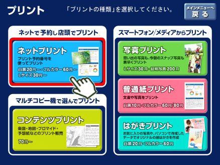 セブン-イレブンのマルチコピーのメニュー画面で「プリント」を押してください。