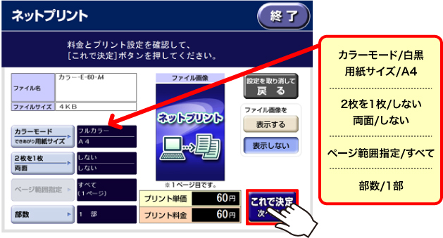 内容とプリント料金を確認後、「これで決定」を押してください。