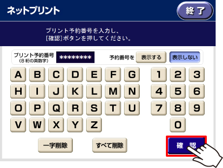 8桁のプリント予約番号をご入力ください。8桁のプリント予約番号は結果連絡の際にお伝えした番号です。
